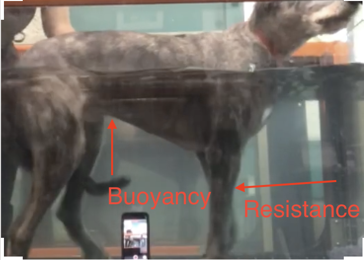 Swimming encourages forelimb exercise and cardiovascular exercise, but most dogs minimally use their rear end while swimming. As mentioned, the underwater treadmill utilizes gravitational forces which aids in bone healing and strength, which is key with post-op knee surgeries, fractures, and weakened bones and muscles. Additionally instead of training a swimming gait, the underwater treadmill allows us to coach a normal walking or trotting gait, particularly in our neurologic patients who are relearning how to walk.