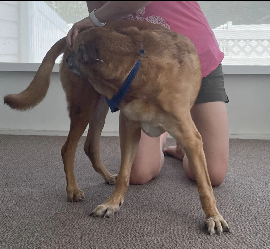 The key for this exercise is to have one hand under the belly and the hand with the treat is reaching out to “stretch the spine”.
