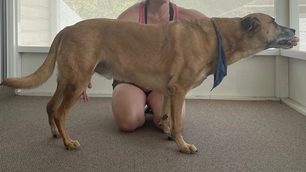The key for performing this exercise is to have the rear end closest to you to prevent them from spinning in a circle. You can also help to keep them from sitting with a gentle hand under their belly.
